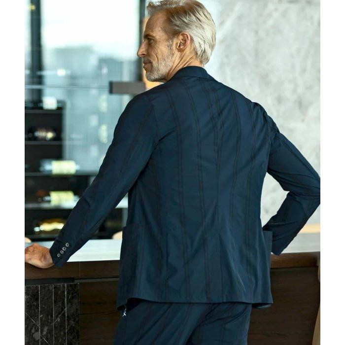 胸元に配置した縦使いのブランドロゴも相まって、ラグジュアリーかつスマートな一着に仕上がりました。同生地のパンツ(usb-23033)と合わせてセットアップとしても着用できます。