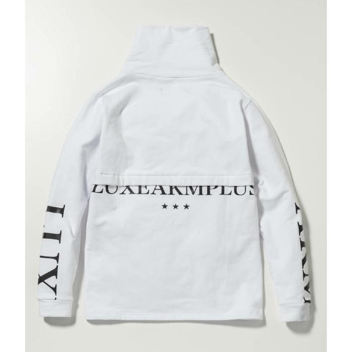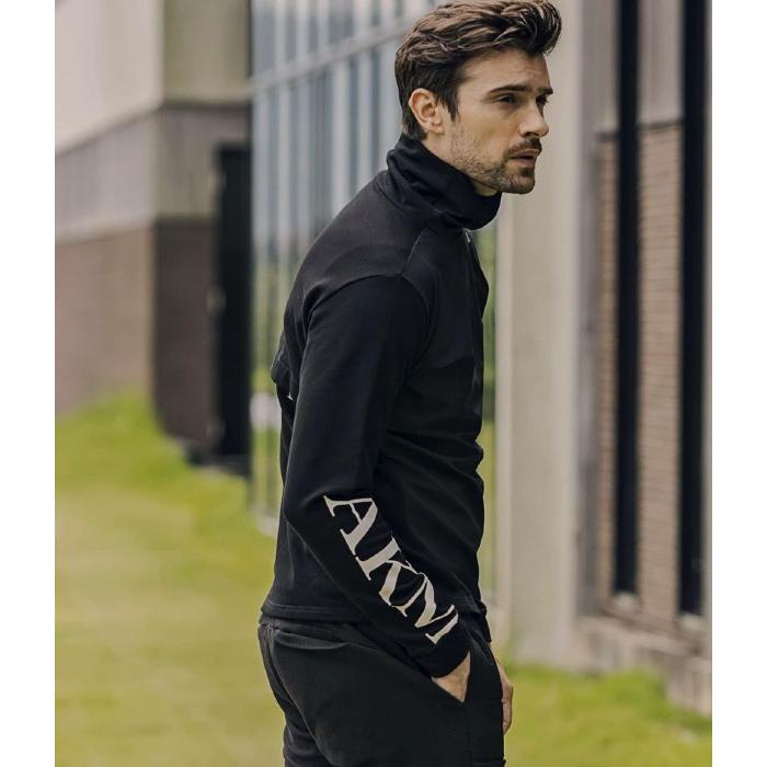 両袖に配置したブランドロゴが目を引くハイネックシャツ。