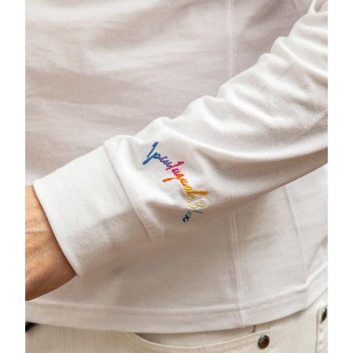 ベーシックな長袖クルーネックTシャツの袖にレインボーカラーのブランドロゴを配した、レインボーシリーズの新作です。レインボーカラーのロゴは小さいながらもきらりと存在感を主張、全体的にはシンプルなのに、しっかりと遊び心ある印象に仕上がりました。
