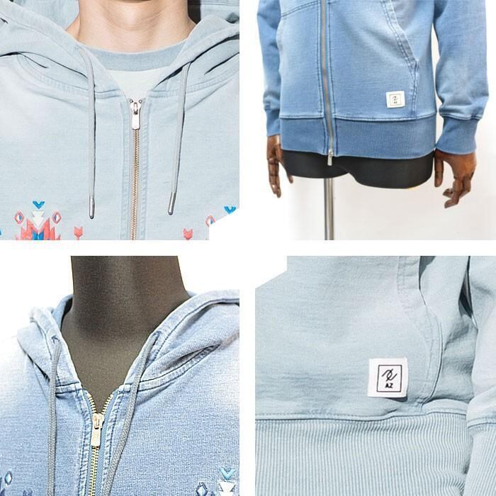 インディゴ染めによるデニムのような色と風合いが特徴的な生地に、刺繍デザインが施されたフードパーカ&パンツ