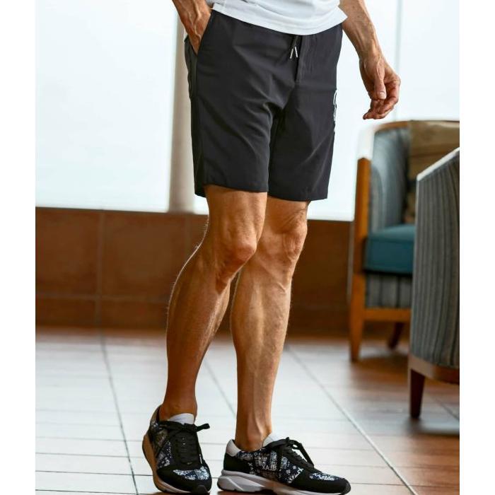 人気の筆記体調ロゴを刺繍で配置したハーフパンツ。