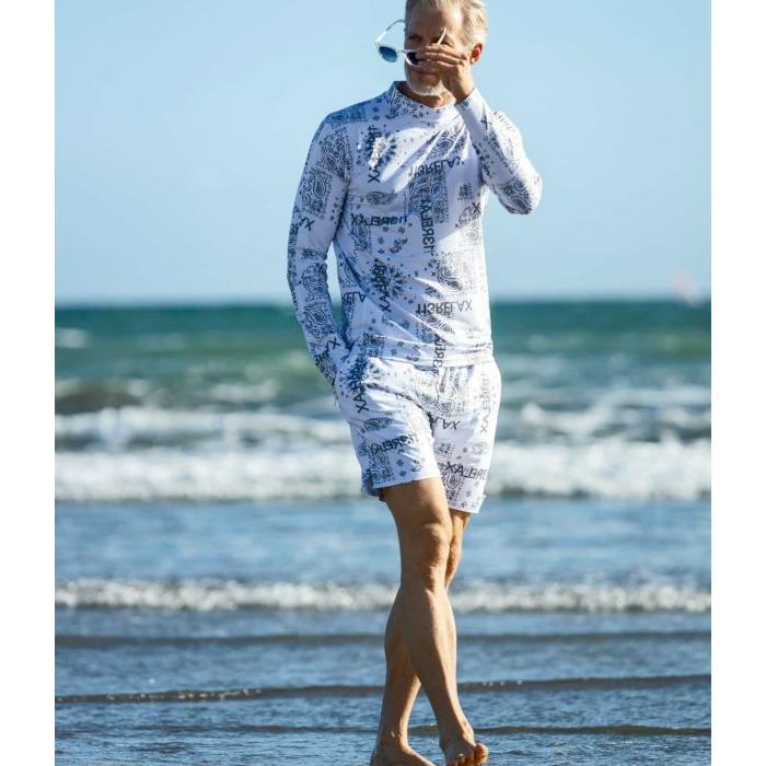 海辺での日焼けや擦り傷などから肌を守ってくれるラッシュガード。吸水速乾・UVカット機能を備えているので、夏のレジャーシーズンの必須アイテムとして活躍します。オリジナルで作成したペイズリー柄がシーズンらしい爽快感を纏う一着。夏を楽しむ大人のラッシュガードシリーズに注目です。