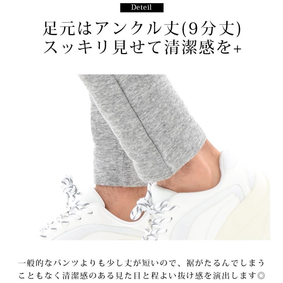 杢調のライトオンスのスウェットを用いた霜降り柄のスウェットパンツ。 拘りのサイジングは丈の長さを9分(アンクル丈)にし、膝下から裾にかけてテイパードラインを加える事で美脚効果を発揮します。 「部屋着」と言うイメージの強いスウェットパンツもスタイリッシュなシルエット、後ろ姿まで映えるロゴプリントがタウンユースな演出をしてくれます。