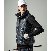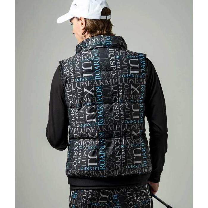 両ブランドのロゴを迷彩のようにミックスさせた総柄の中綿ベスト。モノトーンの配色の中に鮮やかなブルーが華やかなアクセントをプラス。