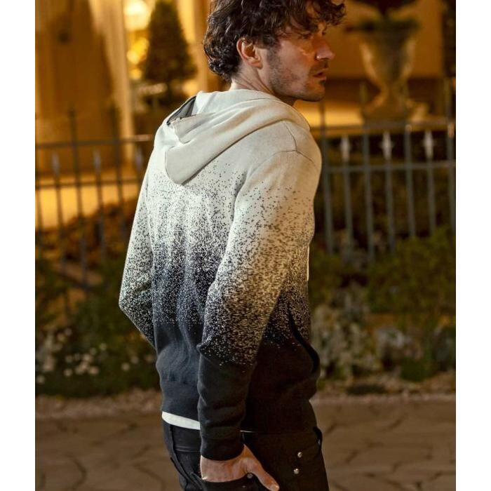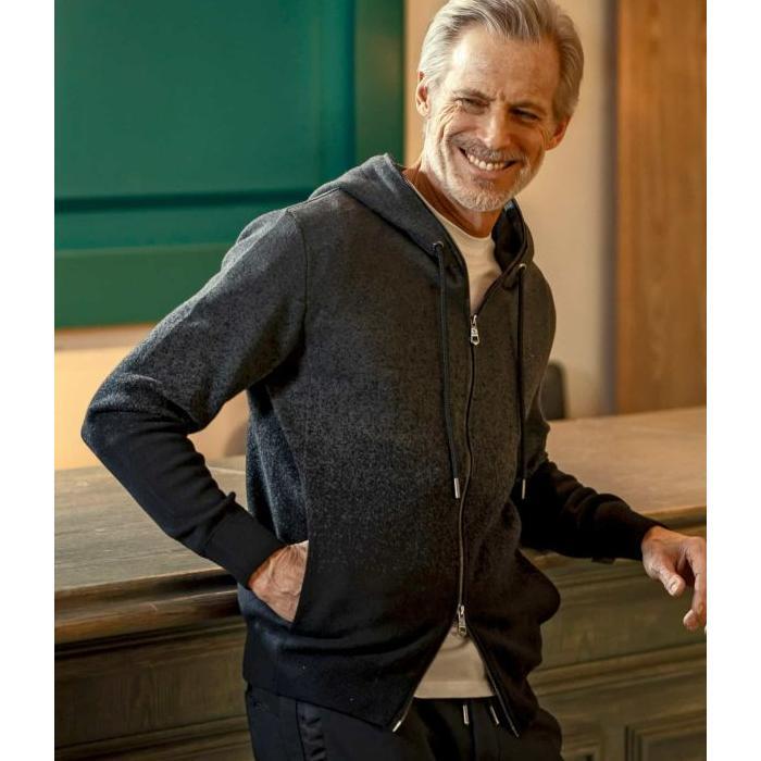 ニットの織りでグラデーションを表現したジップアップパーカー。淡く変化するカラーリングがスタイリングに華やぎを齎します。