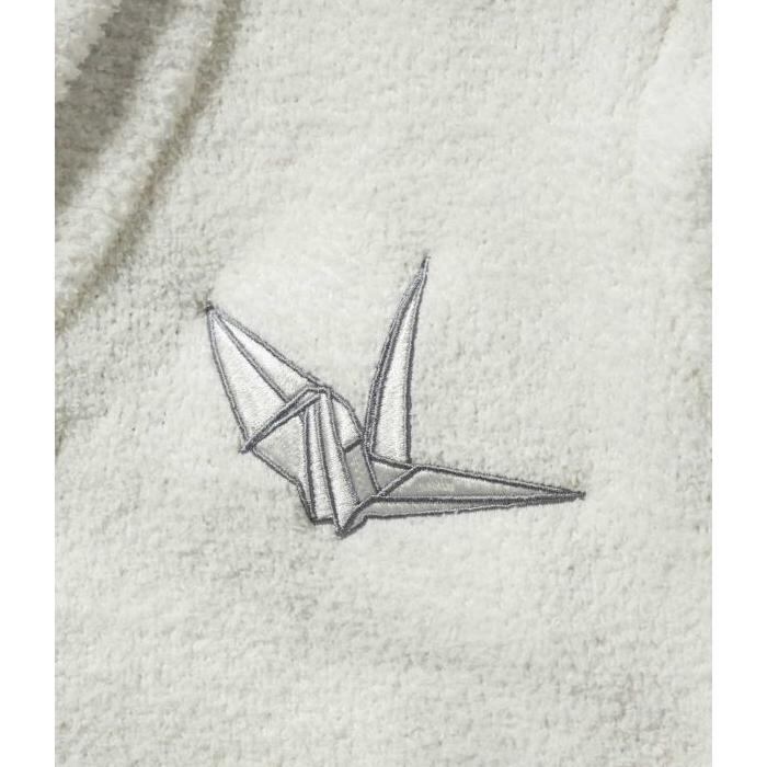 胸元に大きく折り鶴を刺繍しインパクトをプラス。バックには筆記体調のブランドロゴを配置し後ろ姿まで隙なく印象的に仕上げました。