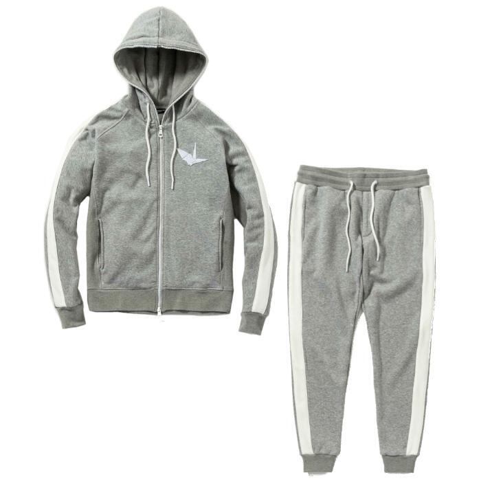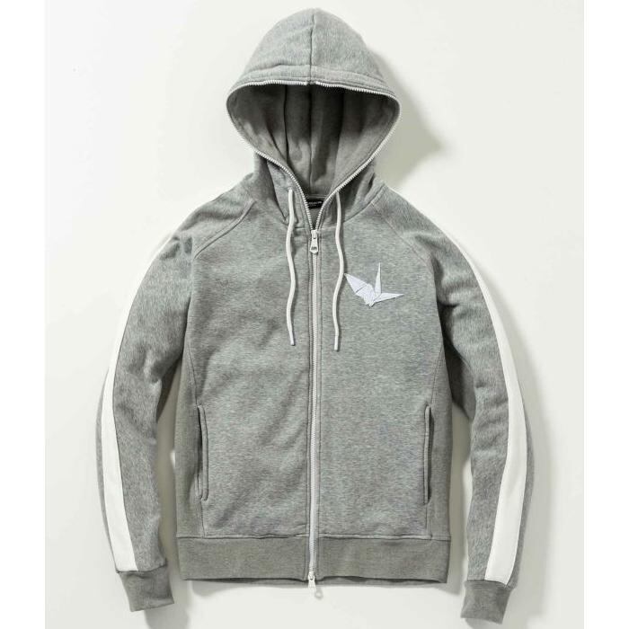 パーカー胸元、パンツのバックにはブランドアイコンである折り鶴を人気の3D刺繍で大胆に配置。