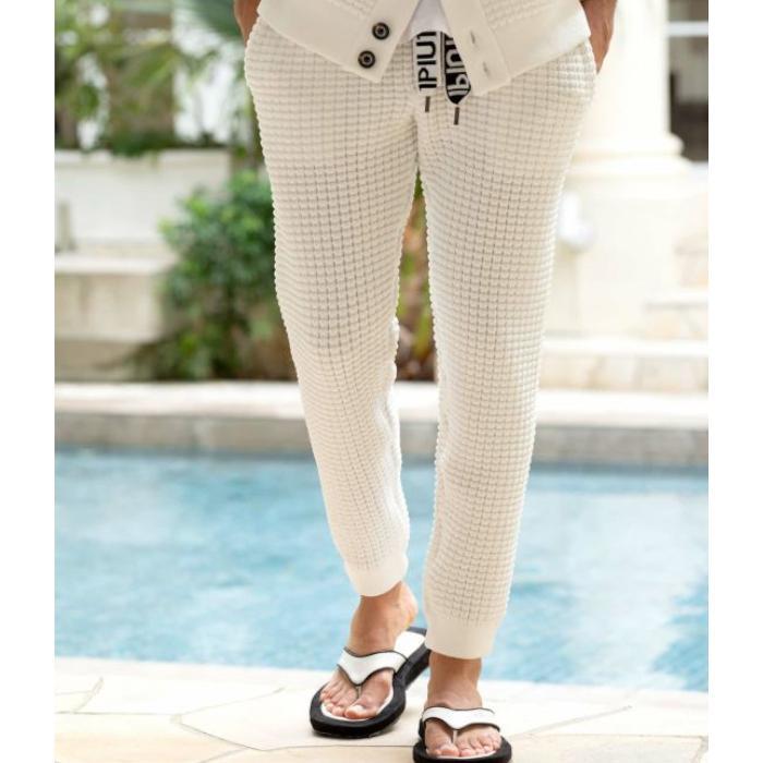 オリジナルで作成したもこもこのワッフル生地が人気のシリーズ。糸を膨らませて格子状に凹凸を出した柔らかな表面感により上質なタオルのような優しい肌触りを形成。伸縮性・吸汗速乾に優れたストレスフリーかつリラクシングな着心地が魅力です。ブランドロゴを施した太めのスピンドルがキャッチーなアクセントに。