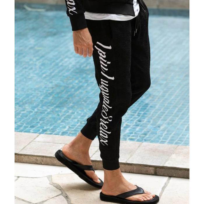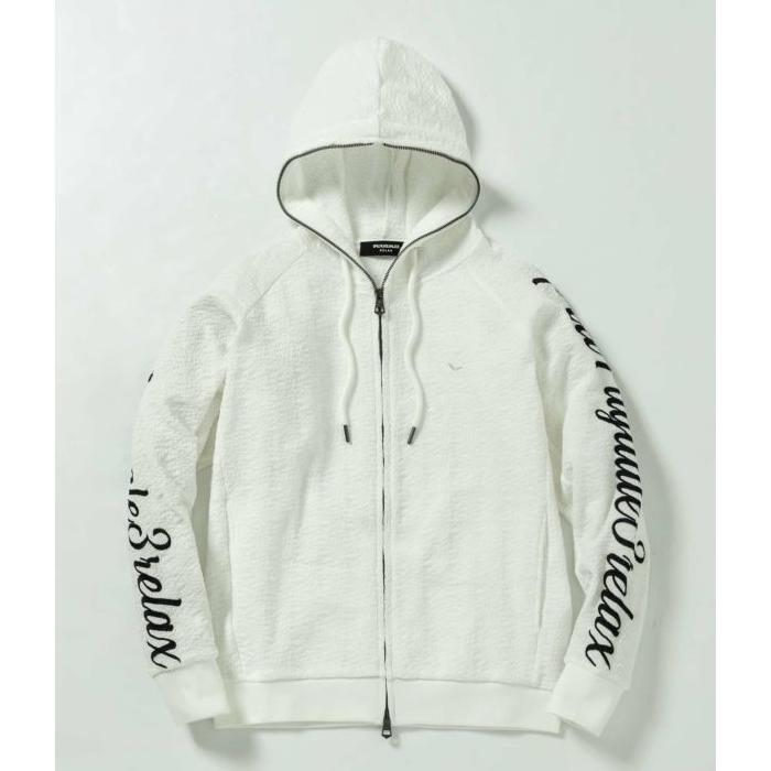 凹凸のあるシボ素材が肌に触れる面積を減らし、通気性に優れた清涼感のある着心地が魅力のセットアップ。ニットを縫製した特殊構造により、ストレスフリーな伸縮性とスマートなシルエットを両立しています。サイドには人気の筆記体ロゴを大胆に刺繍で配置。リラクシングな表情の中に高級感を漂わせます。