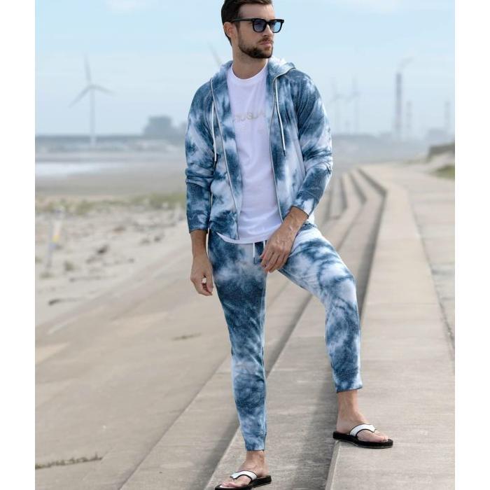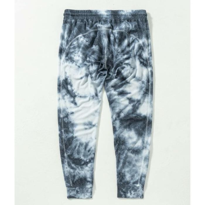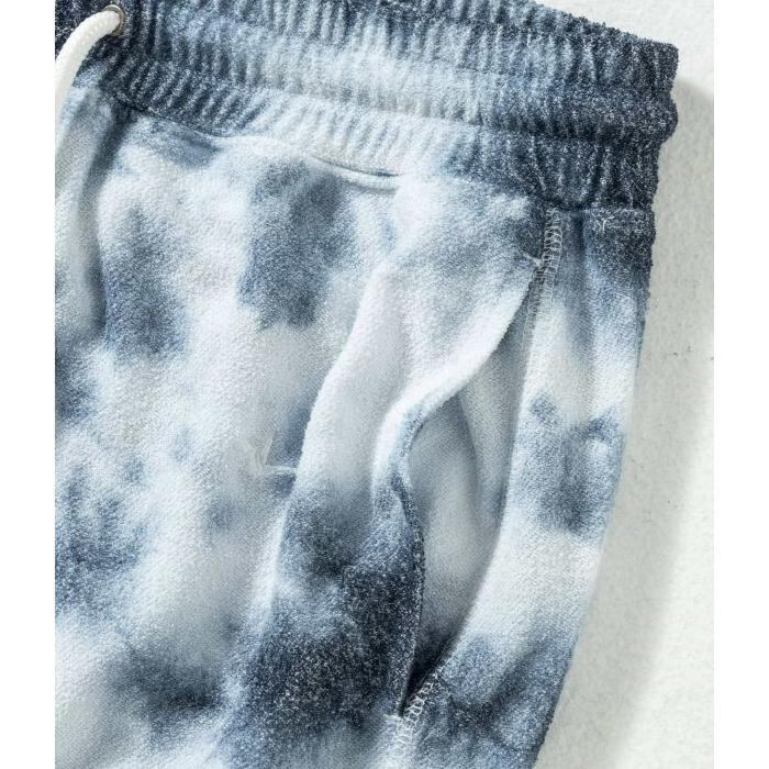 ややシャリ感のあるパイル素材を採用したジョグパンツ。インディゴとホワイトのタイダイ柄がシーズンらしい爽快感を演出。
