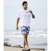 ややシャリ感のあるパイル素材を採用したハーフパンツ。インディゴとホワイトのタイダイ柄がシーズンらしい爽快感を演出。