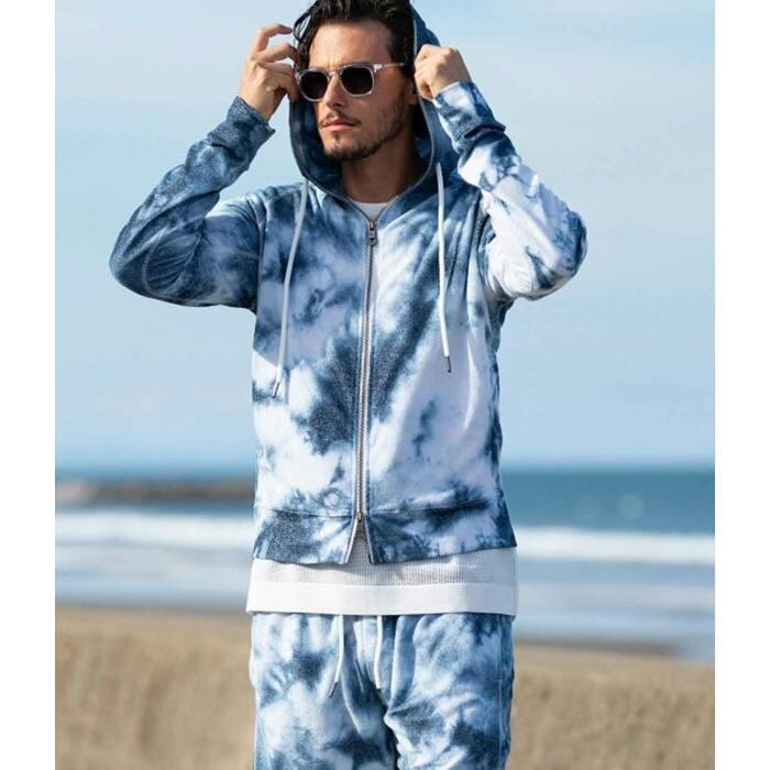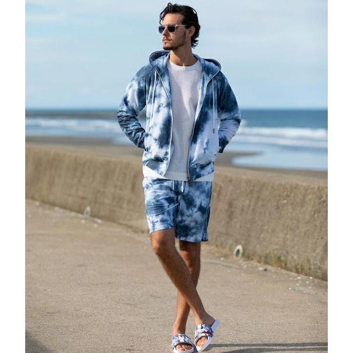 ややシャリ感のあるパイル素材を採用したセットアップ。インディゴとホワイトのタイダイ柄がシーズンらしい爽快感を演出。柔らかくストレッチに富んだストレスフリーな着心地がリゾートシーンに寄り添う仕上がりに。