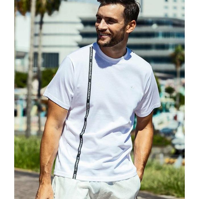 ブランドロゴを縦に走らせた半袖Tシャツ。ラインデザインが爽快かつスポーティな印象を演出します。
