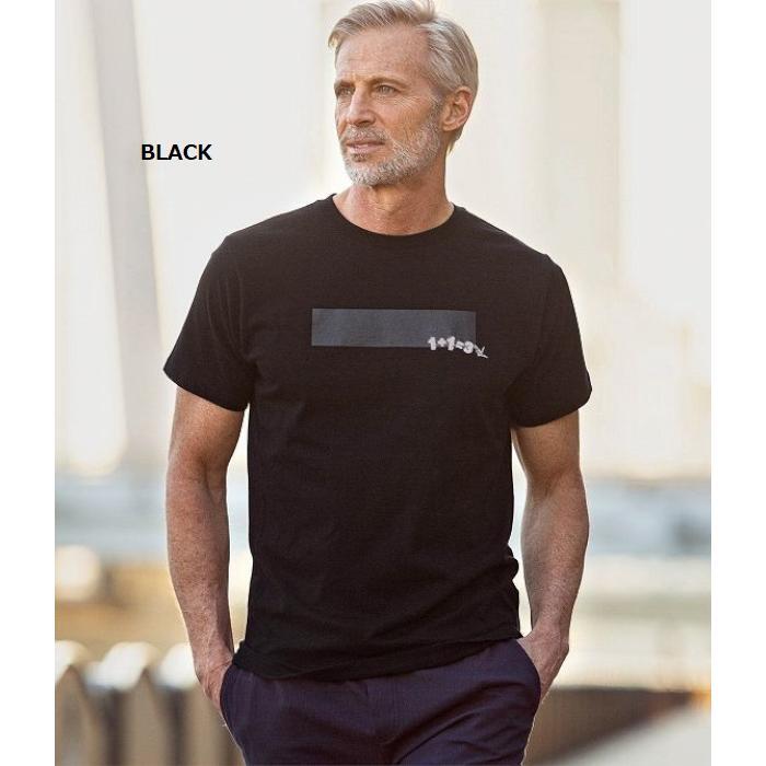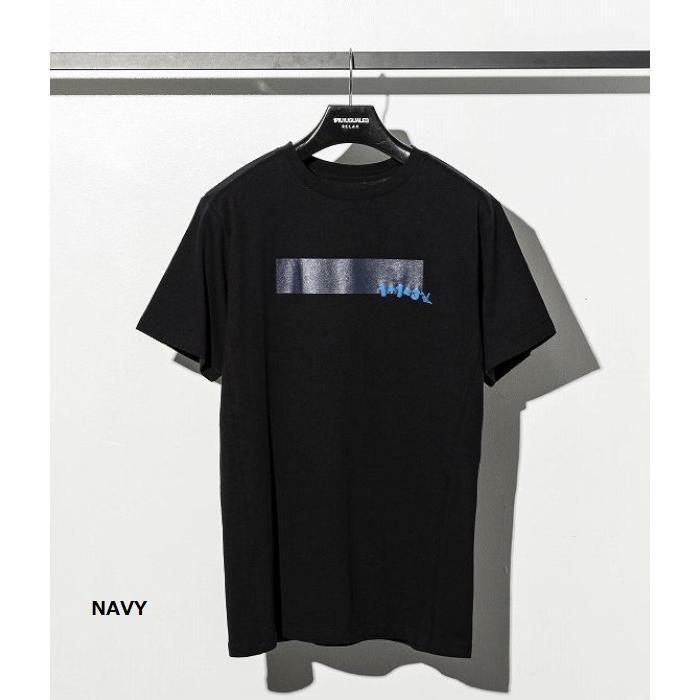 光沢のあるラバー素材を使用した同色のボックスプリントがポイントのクルーネックTシャツ。その隅に重ねるように配したブランド名の意を持つ"1+1=3"が目を惹きます。
