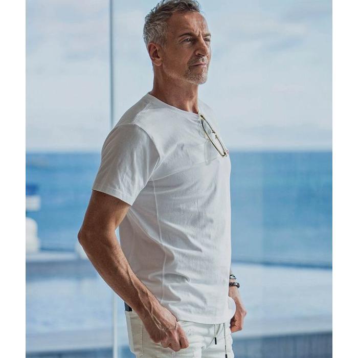 肩から袖下に切り替えを入れた立体的なシルエットと、柔らかく吸水性に優れたコットン100%の肌ざわりが極上の着心地を演出。
