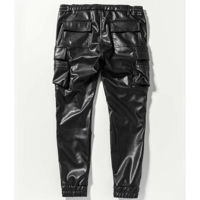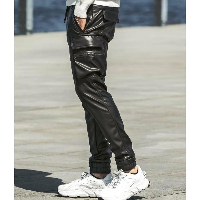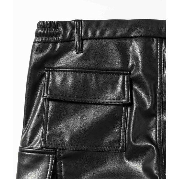 男のスタイリングに欠かせないミリタリー要素を持つカーゴパンツ。無骨な印象の強いカーゴを、上品な艶感のフェイクレザーと細見シルエットでスタイリッシュな一本に昇華しました。