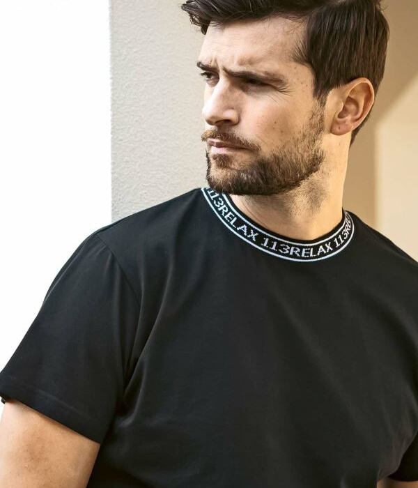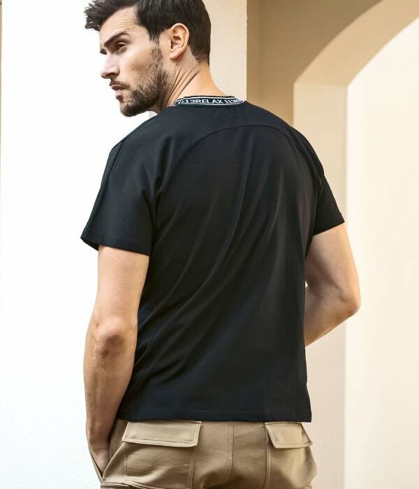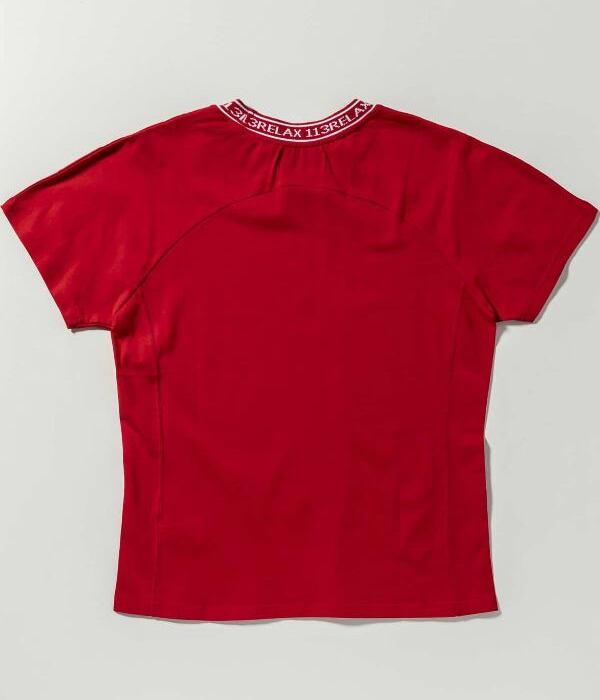 ネックにブランドロゴを印象的に配置した半袖Tシャツ。ライン状のデザインがスポーティな表情を形成します。