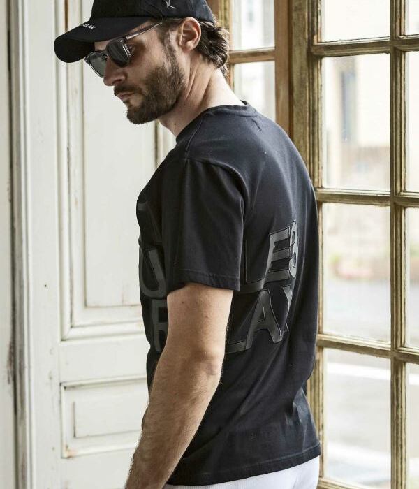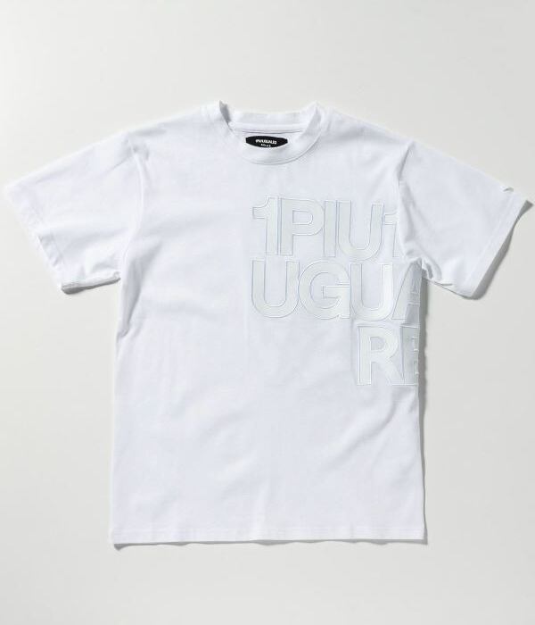 ブランドロゴを大胆に配置した半袖Tシャツ。同色でデザインしたフェイクレザーのアップリケが大人に似合う高級感を演出。