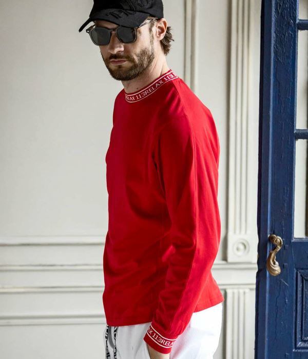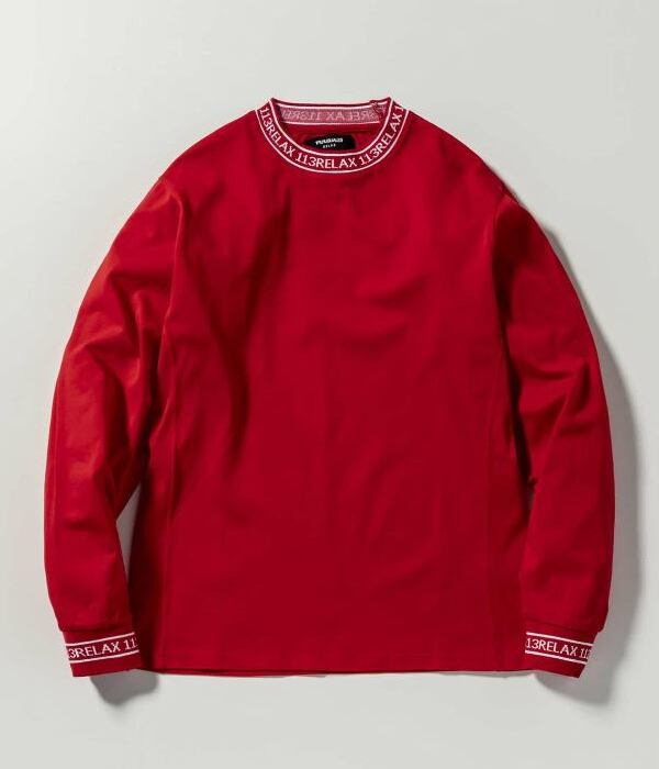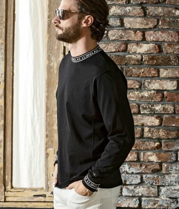 ネックにブランドロゴを印象的に配置したロングTシャツ。ライン状のデザインがスポーティな表情を形成します。