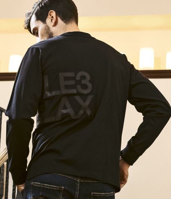 ブランドロゴを大胆に配置したロングTシャツ。同色でデザインしたフェイクレザーのアップリケが大人に似合う高級感を演出。