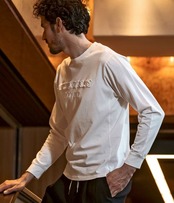 フロントにブランドロゴを同色で配置したロングTシャツ。シンプルな中にも敢えて切りっぱなしにしたダメージ加工が男らしい無骨さを演出。
