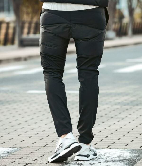 膝から上に中綿を仕込むことで保温性能を向上。膝下には軽量かつ暖かな裏起毛カット生地を採用し、敢えて中綿を入れないことですっきりとしたテーパードシルエットを演出しています。